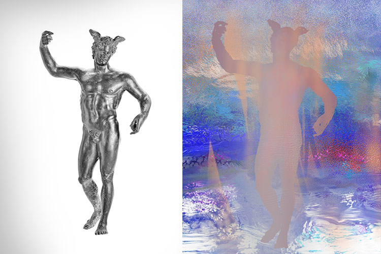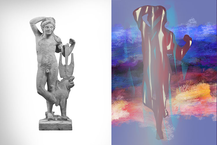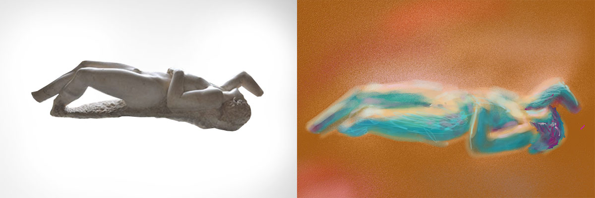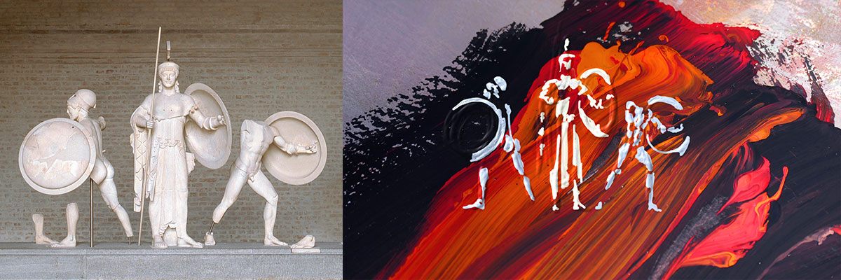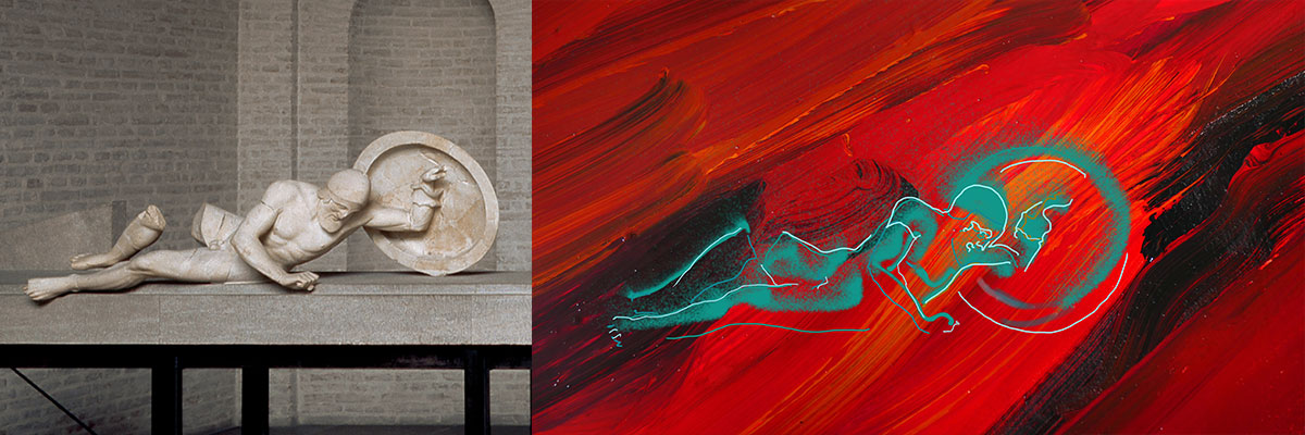 Diese beiden äußersten Figuren des Ostgiebels von Ägina zeigen erstmals in der Antike Emotionen. Die Kälte der digitalen Texturen auf diesen Bildern steht gerade hier in einem pointierten Gegensatz zu diesem emotionalen Thema, wodurch die grundsätzliche Problematik maschineller und immaterieller Malerei vorgeführt werden soll. In diesem Raum wird die Beziehung von Mythos und Natur zum Thema.