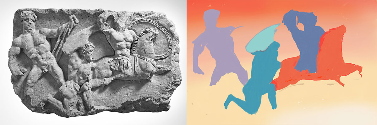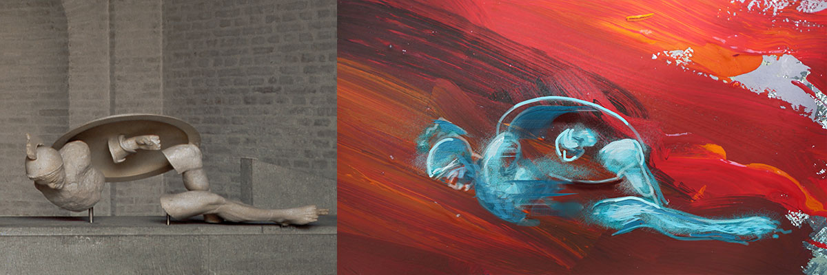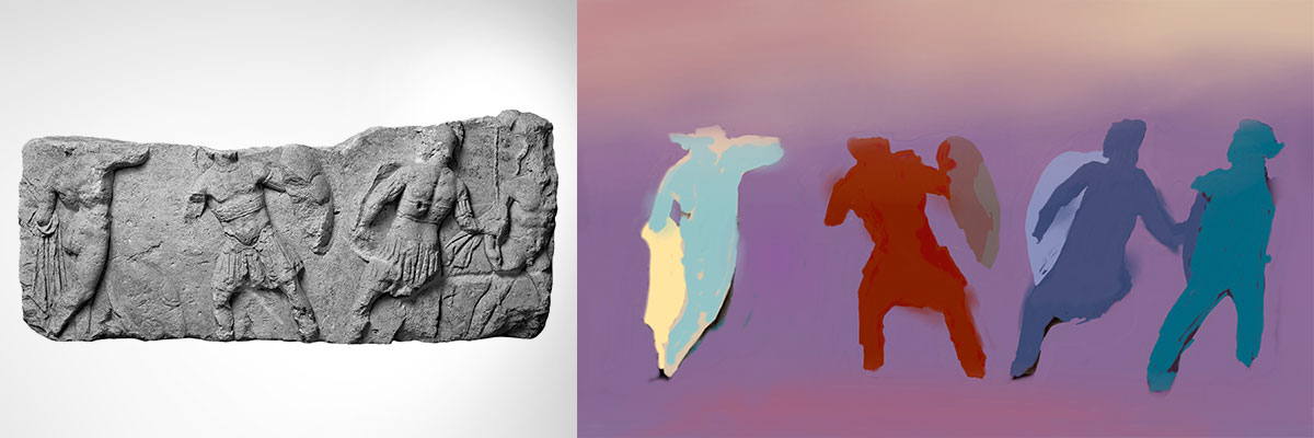 Die Paraphrase der Trierer Kampfreliefs in erstarrter Momentaufnahme wirkt provokativ in der minimalistischen Reduktion auf Begrenzung durch die Umrisslinie oder die schattenhafte Gegenlichtsituation: