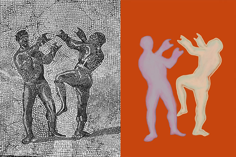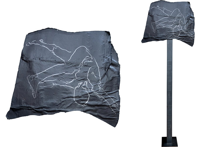 Kampf, Euphorie und Glamour des gesellschaftlichen Rituals sportlichen Wettkampfs werden mit der vitalen Dynamik physischer Bewegung inszeniert. Leben und Tod: Als Verweis auf Einübung des Kampfes und Vergänglichkeit des Ruhmes werden den starkfarbigen minimalistischen Bildern schwarze Skulpturen als Totem und Mahnmal gegenübergestellt.