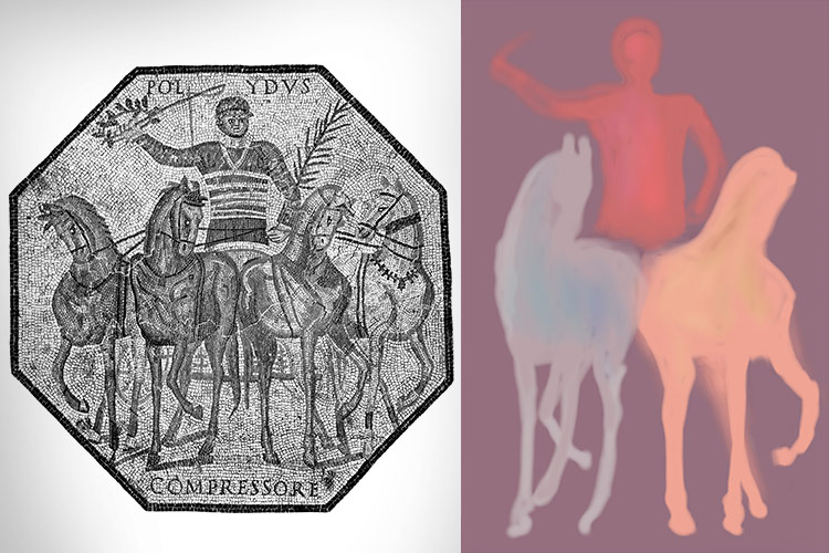 Die Video-Clips vermischen in einer Film-Choreographie (Morphing) jeweils ca. 20 Malereiversionen der Pferde des Wagenlenkers Polydus. In galoppierendem Tempo wird das Rennen zum Tanz der Bilder.